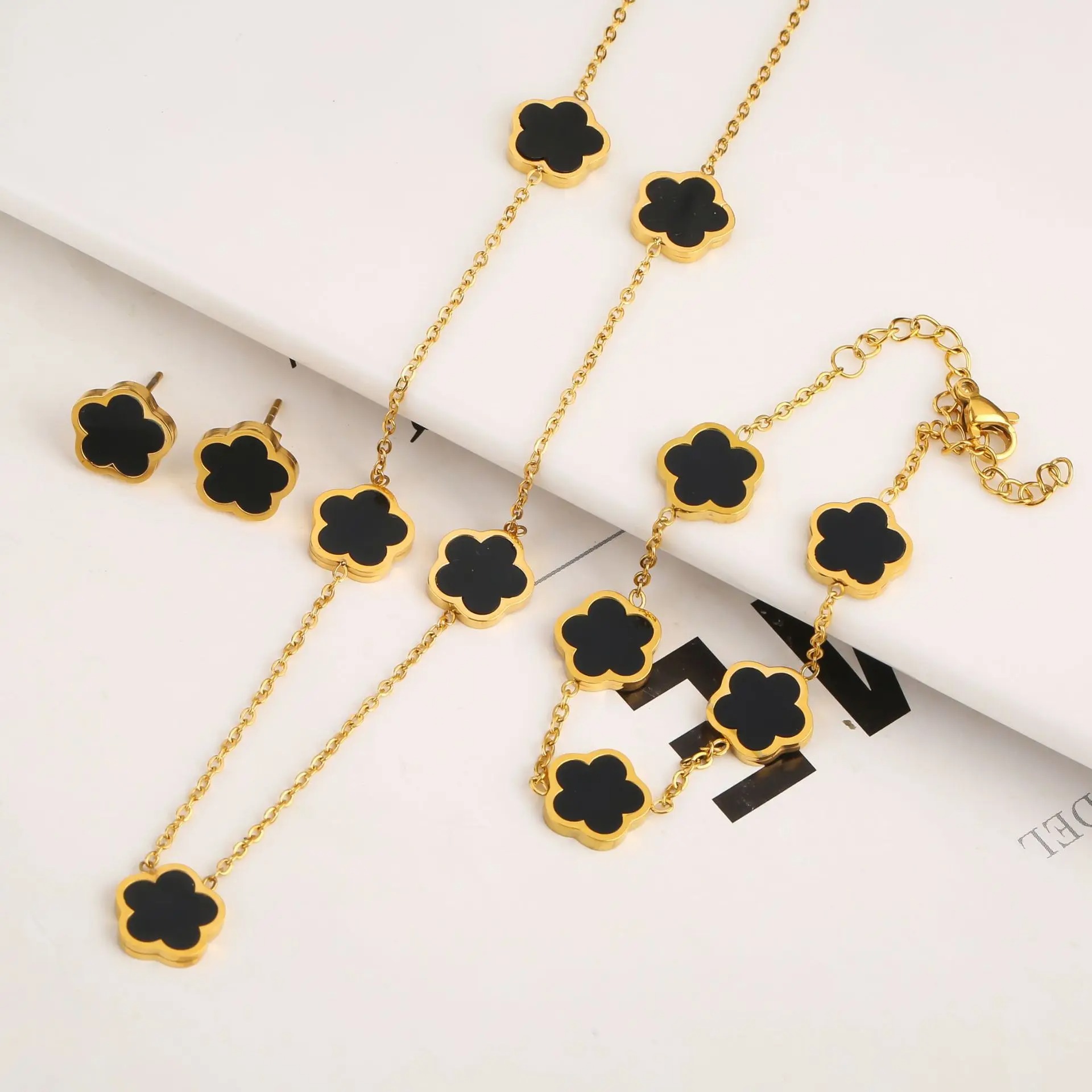 Este deslumbrante conjunto de joias de aço inoxidável é inspirado no trevo-de-quatro-folhas, símbolo de sorte e prosperidade. Cada peça é meticulosamente trabalhada para capturar a beleza da natureza e a elegância do design contemporâneo.