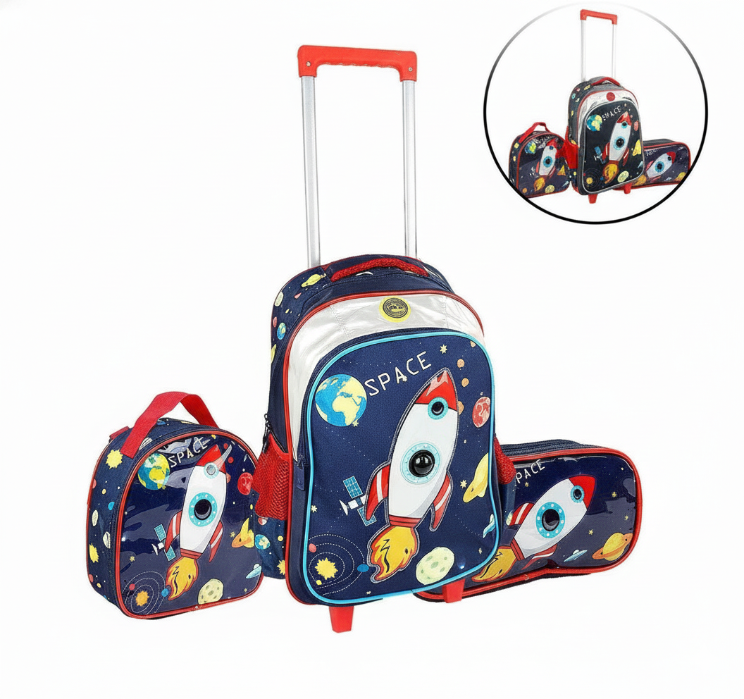 KIT Mochila de Rodas Infantil Foguete e LED 3 Pçs