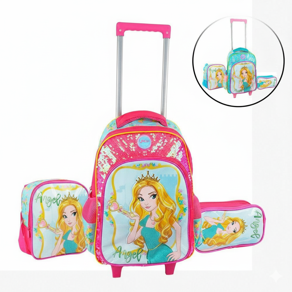 KIT Mochila de Rodas Infantil Princesa Angel 3 Pçs