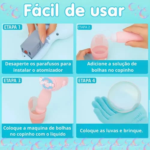 O que vem no kit? O kit é completo e inclui: 1 Varinha Akilario, 1 frasco de líquido de bolhas, 1 par de luvas mágicas, 1 cabo USB e o atomizador interno.